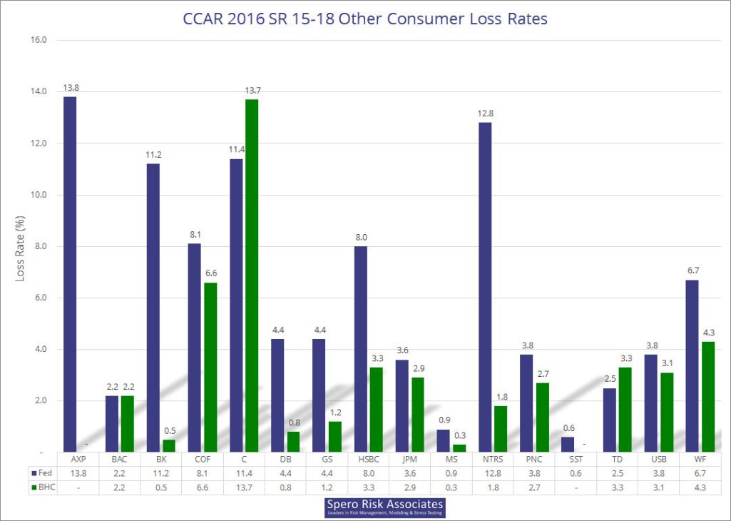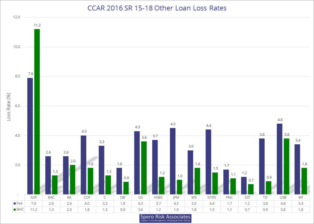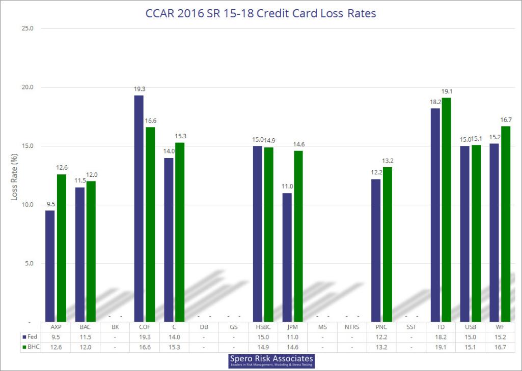 The slideshow below consists of 16 graphs: eight for the SR 15-18 firms and a matching eight for the SR 15-19 firms. Each graph presents the Fed’s and the firm’s forecasted average loss rate for each portfolio.